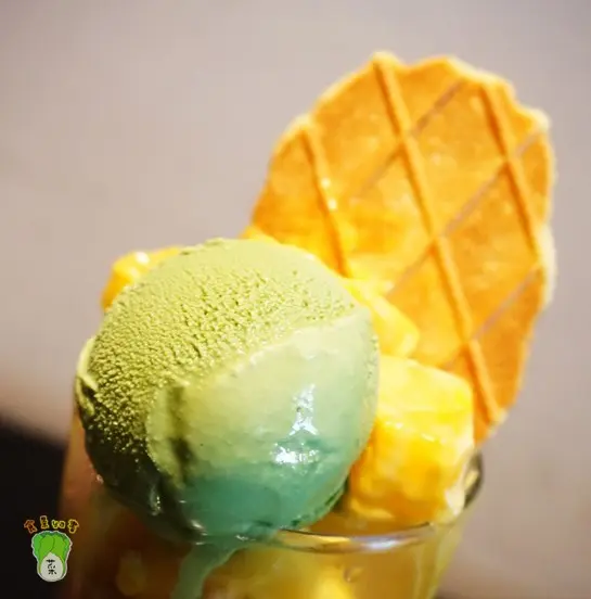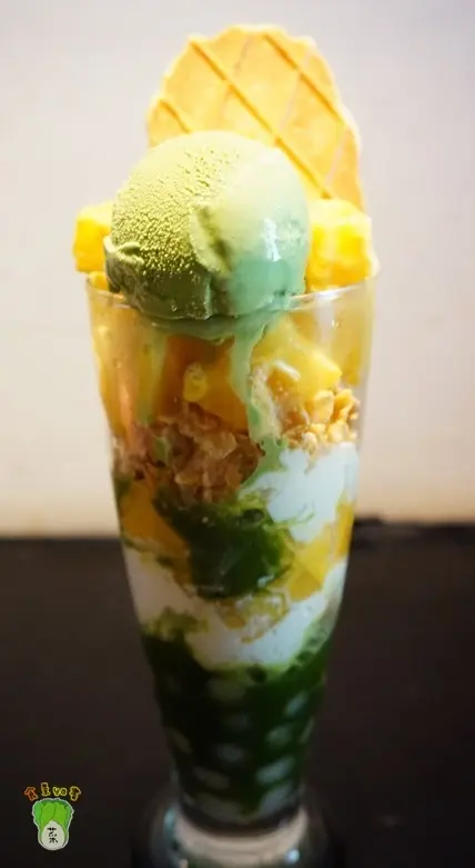 最頂端,是一球抹茶冰淇淋及煎餅,兩者中間夾著許多芒果