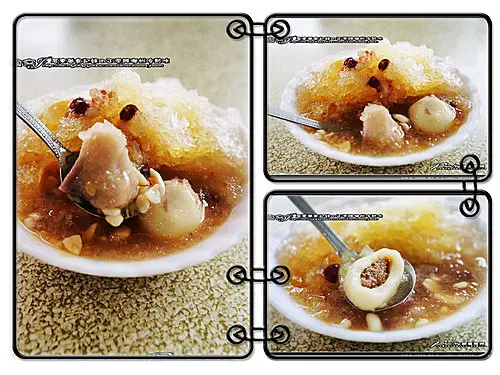 綜合冷熱冰:配料很豐富,內容有芋頭、大小湯圓、花生、 糯米、紅豆、綠豆蒜等,花生煮的很爛易入口,小湯圓很Q ,不過芋頭煮的不夠熟爛偏硬,冰內有點甜度暑於南部甜, 大湯園內餡為花生,我對於大湯圓特愛,要是在多幾顆就很 滿足。整體度與美味度:★★☆☆☆