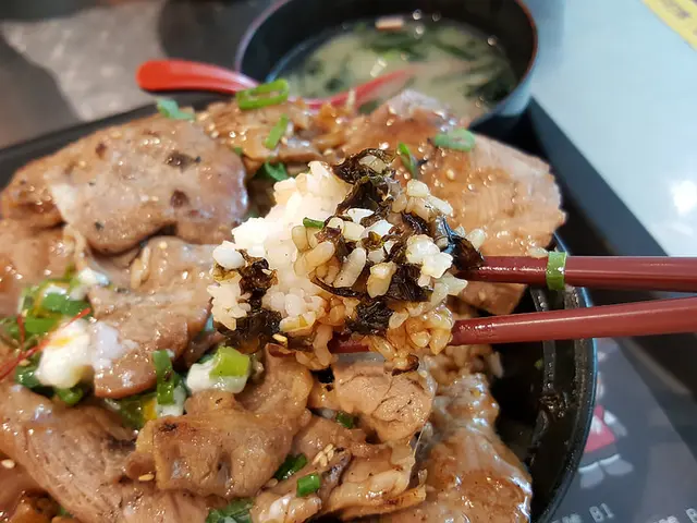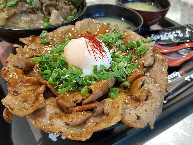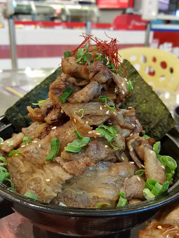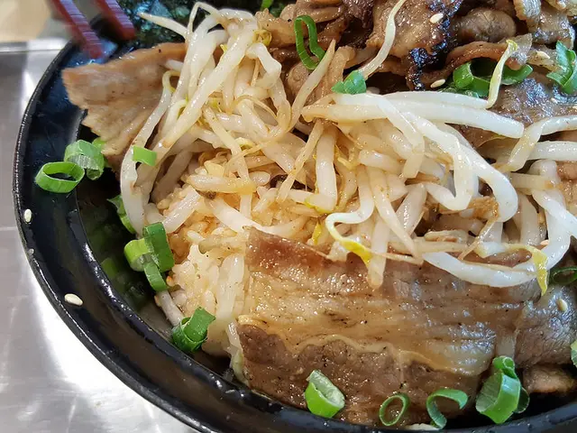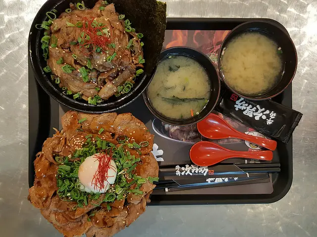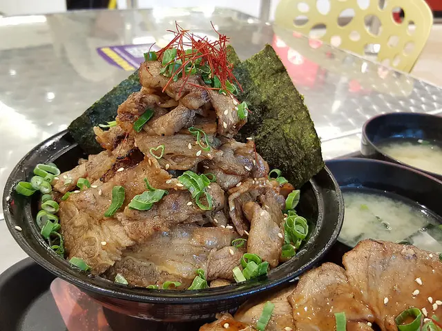 與豚丼的配料有點不同,沒有海苔醬多了豆芽菜,現烤牛五花肉片濃郁的碳香味菓子非常喜歡,大片海苔可以包裹著牛肉一起入口,雙重香氣又解膩,我們大約中午11點半就用餐了,燒肉香到傍晚還殘留在口中XD