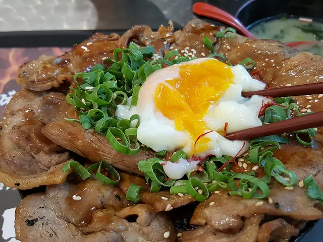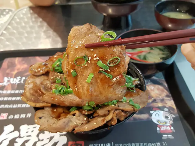哇喔~滿滿的~滿滿的~『肉』!完全把白米飯覆蓋過去,只看到『肉』!還跟M先生討論從何吃起,豚丼上頭灑滿了蔥花,加了一點辣椒絲點綴