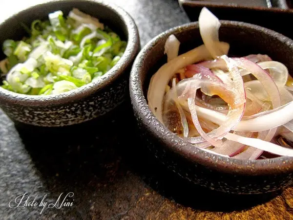 沾醬有檸檬汁&日式和風沾醬,酌料是涼拌紫洋蔥&鹽蔥花