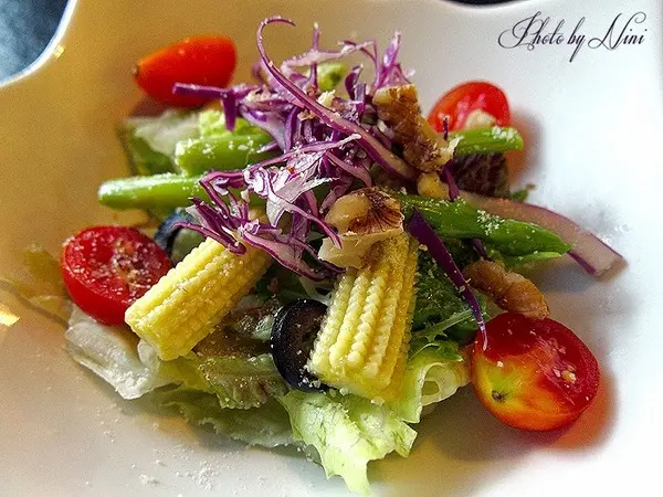 新鮮的蘿蔓、蘆筍、紫生菜、玉米筍及小番茄,灑上核桃、橄欖和起司粉