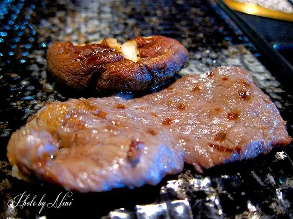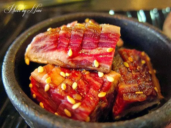 經醬燒調味過的骰子牛肉在服務員快速的在烤爐上翻轉幾次後叮矚"快吃"