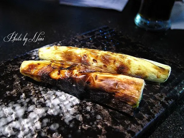 玉米筍就要烤久一點,將外皮烤到微微的焦黃後剝開