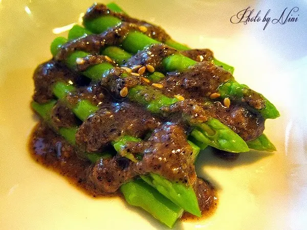 綠蘆筍川燙後淋上特調芝麻醬,新鮮的蘆筍緩解了剛剛主食的油膩