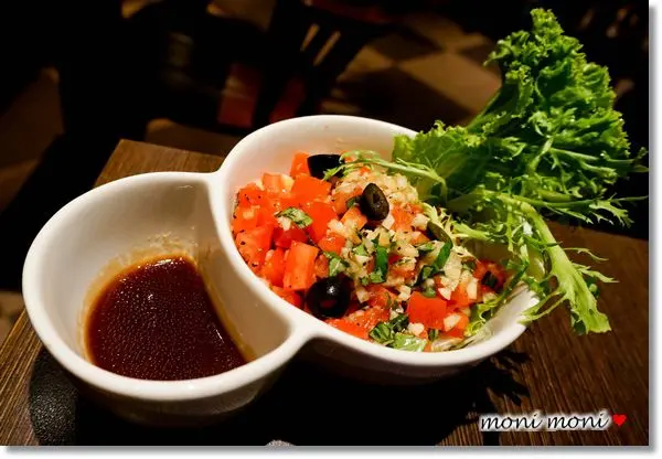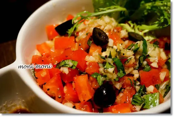 這份沙拉和一般的不太一樣,沒有大片的生菜,反而是滿滿的小紅番茄切丁、黑橄欖與洋蔥、蒜泥、橄欖油、九層塔葉,