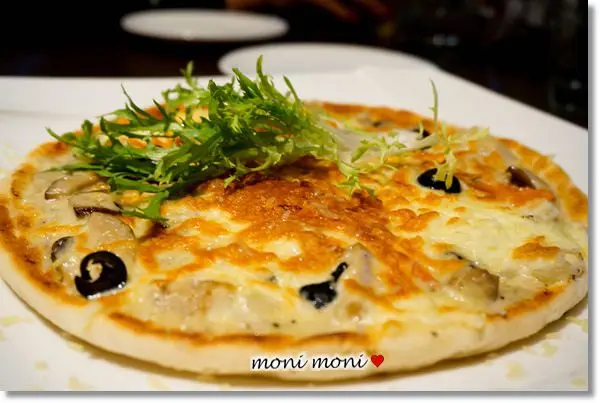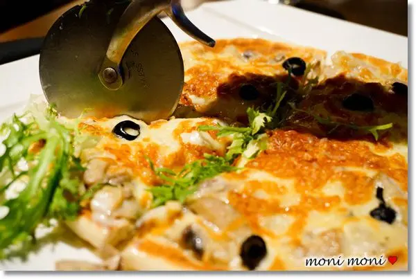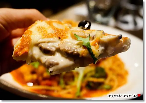 通常披薩都是乾乾的配料,這款反而會熱呼呼的白醬湯汁,我個人超喜歡白醬的味道,裡面有小蘑菇和黑橄欖。