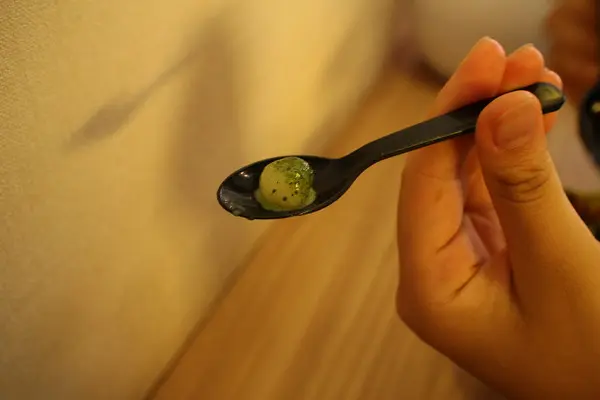 妹妹說,如果鋪在冰的旁邊,配著抹茶冰一起吃,應該會比較好吃。