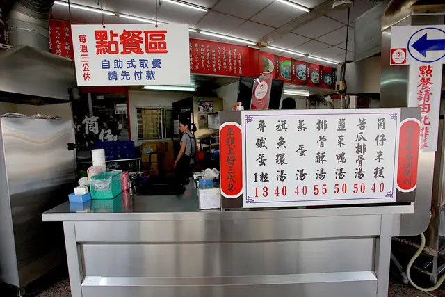 店家得用餐空間與廚房都很整潔,點餐在這裡排隊點餐與結帳,櫃台上有菜單有筒仔米糕40元、苦瓜排骨湯50元、鹹菜鴨湯50元、排骨酥湯55元、蒸蛋湯40元、旗魚還湯40元及滷鐵蛋13元等。