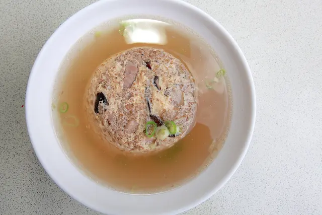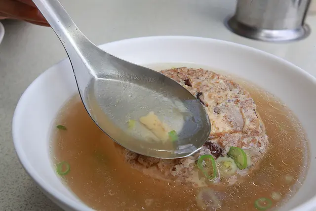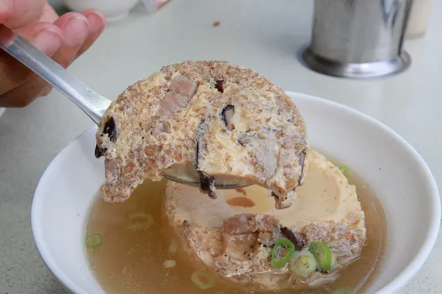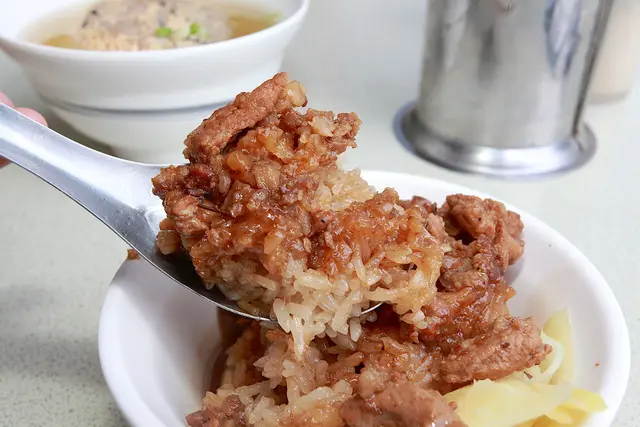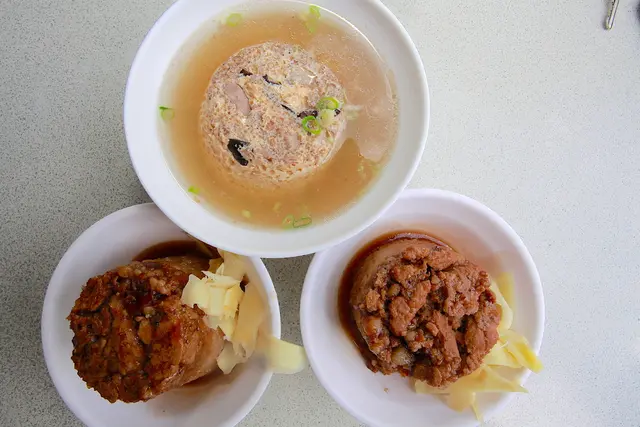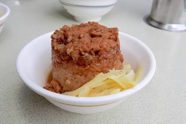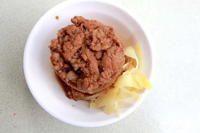 小高本人是比較喜歡筒仔米糕口感,因為這種米糕糯米會很入味,雖然店家的米糕40元稍微偏貴,但是米糕很大顆且上滿滿肉塊,所以這顆筒仔米糕定價算是合理,碗中有淋上肉燥鋪上醃漬薑片。
