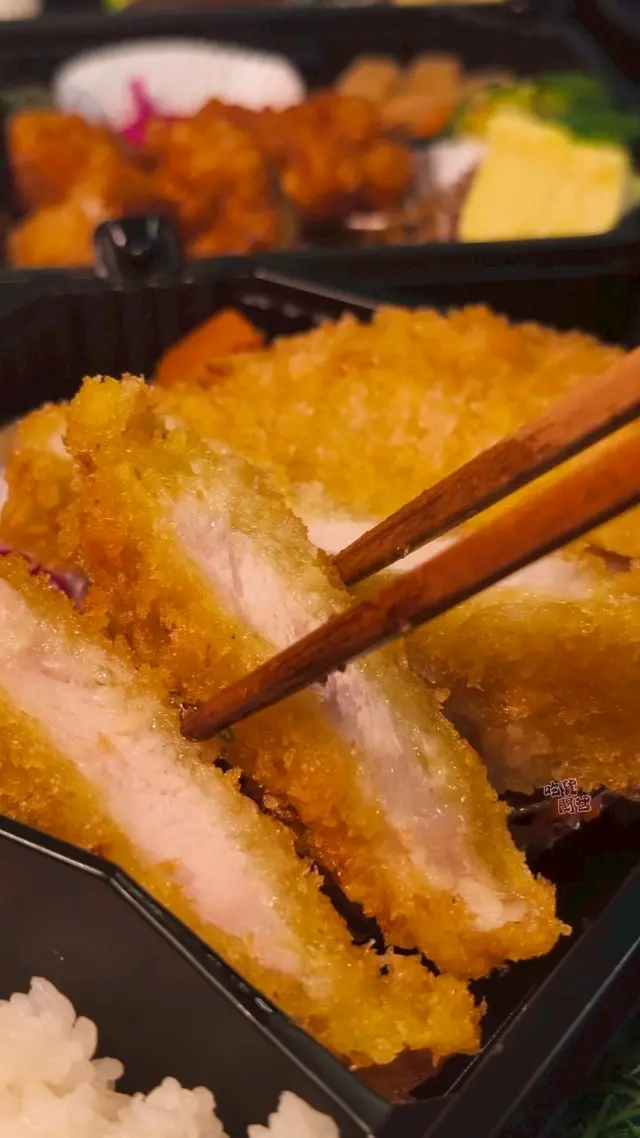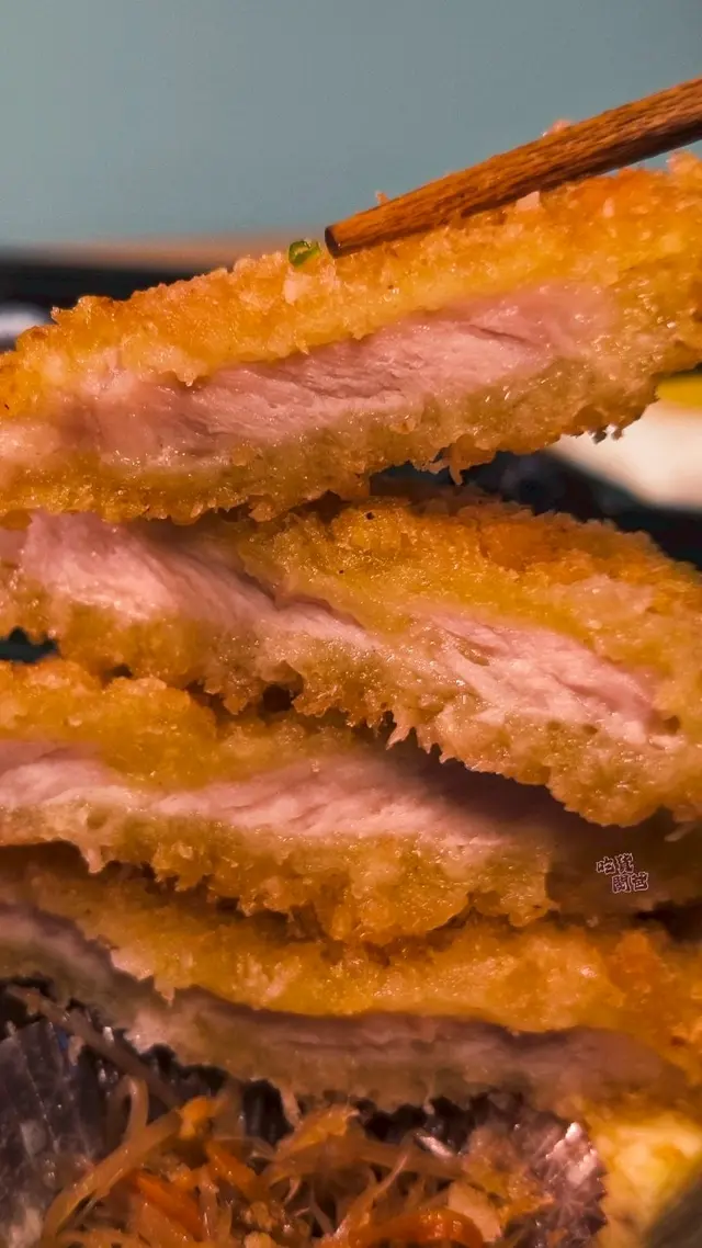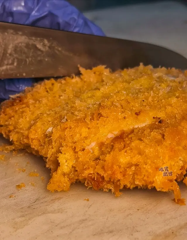 裹著麵包粉的表皮,經過油炸後是討喜的酥脆口感,這剛炸好的豬排立馬咬下去會有清脆的咖滋聲!