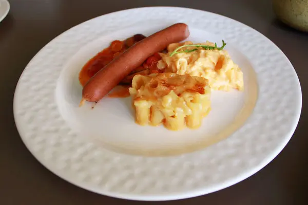 西式主食有香腸、焗烤麵、炒蛋