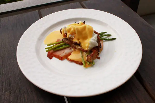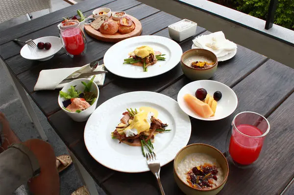 然後是第二天的早餐,因為前一天來太晚沒搶到戶外座位,第二天就更晚下來吃,人幾乎都走光去 check out了,結果順利坐到露天座位用餐,有遮陽但太陽有點小曬,不過早上的溫度還可以接受