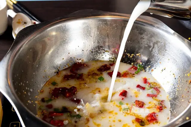 只要點上任一乾鍋系列,每一人頭加80元,即可享有一鍋兩吃的高湯湯底。這高湯使用整隻豬龍骨,耗費時10多個鐘頭熬煮出龍骨中的大量骨髓,柔軟多脂的骨髓釋放後即成了乳白色的「龍骨高湯」。這二年的湯頭又再更為升級,加入了大量的雞腳增加了膠質,變成了豪華版的「龍鳳高湯」,來到大宅門務必要加價品嚐這無添加的美味高湯。
