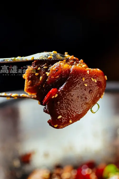 每塊豬腳已切成適合入口的大小,豬腳已燉得軟爛,豬皮仍保有彈性,與大量辛香料拌炒,每塊豬腳肉都均勻的爬附著醬汁。這道相較鴨頭較為濕潤,醬味也比鴨頭來得重,香料的辣度層次也更明顯。