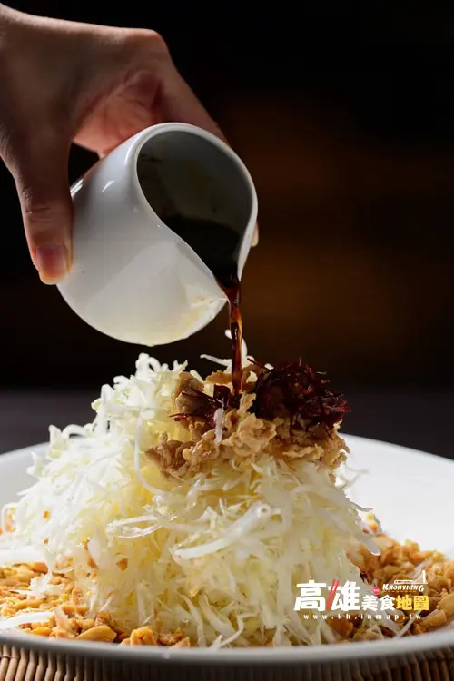 大白菜切成細絲,淋上的醬料以川椒油與特選陳年老醋為主角,白菜絲因切的夠細才能快速的吸收醬汁,白菜的甜味、醋溜的酸 、川椒的香,再連同肉末、花生一起食用,是道清爽又夠味的開胃涼菜。