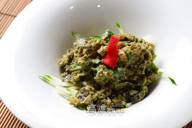 【皮蛋擂辣椒】皮蛋特別選用無鉛的「松花皮蛋」,將皮蛋搗碎後再拌入特製調味,帶有微微的辣油香氣,黏稠的口感因為有了小黃瓜絲的脆度而有了特別的層次,也是大宅門的私房功菜。食用前攪拌均勻,皮蛋蛋黃口感滑順又不會有阿摩尼亞的嗆鼻味道,微辣的辣度及小黃瓜又平衡了黏稠口感,十分少見又特別的私房料理。
