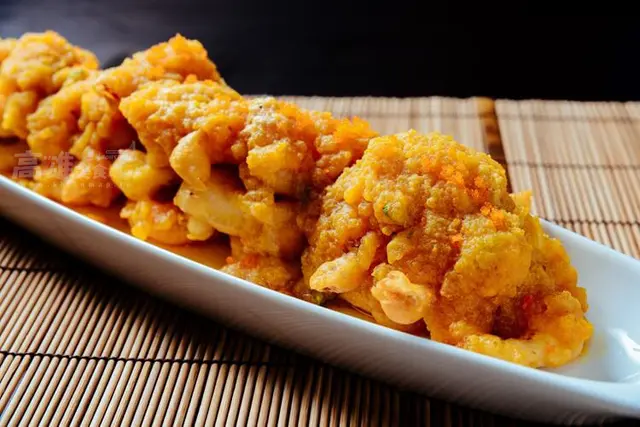 大量的鹹蛋黃用大火油炸逼出香氣後再與中卷快火拌炒,無需多加調味,鹹蛋黃的酥、香、鹹與中卷的鮮味就是最天然的調味。中卷也因大火過油後保有脆度,兩者香氣相輔相成,這道菜也深受饕客喜愛。