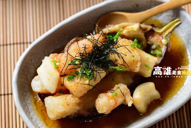 茄子採用日本圓茄,用中溫慢火油炸讓直到茄心軟爛,再舖上酥炸過的蝦仁、花枝、蟹肉等海鮮,就像一艘可愛的小船滿載著海鮮歸來一般。淋上清爽的和風醬汁,圓茄也因油炸過後毛細孔打開了,而能快速的吸收了醬汁入味。