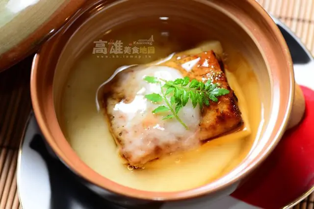 這道也是師傅的創意料理,鰻魚塗上特製醬汁燒烤,舖在雞蛋豆腐上後,再裝盛在山藥泥與柴魚高湯中。整體的口感是又滑又嫩,山藥滑溜,鰻魚也入口即化,燒烤的醬香與上頭舖在上頭的山椒葉的更是激盪出特別的香氣。
