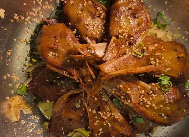主秀肉蟹嗑起來飽嘴,蒜蓉、辣椒、蔥等配料來大火爆炒,吃起來是外酥裡嫩、香辣的口感。 老婆說爆炒到金黃酥香的蒜蓉是這道菜的靈魂,也是非常下飯的菜色!