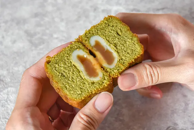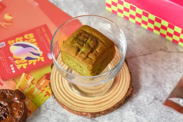 蛋糕體使用台灣特選艾草粉入料,再搭配法國發酵奶油製作而成,口感濕潤綿密,內餡則是花生Q芯仁,QQ的麻糬包覆流芯花生餡,一口咬下有微微爆漿的迷人感,不論是口感還是香氣都很豐富。