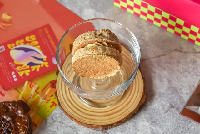 融入麵茶的達克瓦茲餅皮酥酥鬆鬆的,中心的金沙鹹蛋黃餡滑順細緻,再加上些許的鹹蛋黃顆粒更加鹹香,優點甜度,但又不會太甜膩。