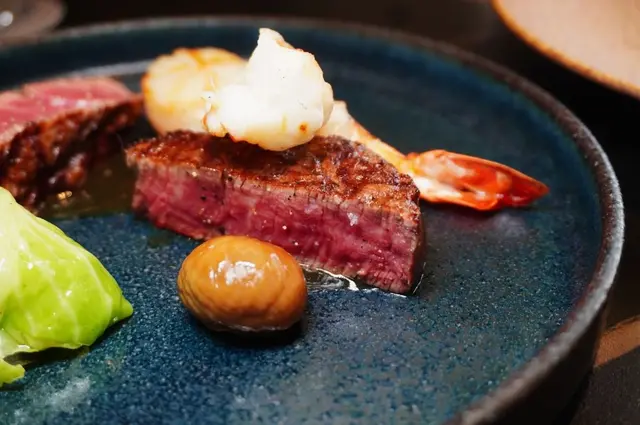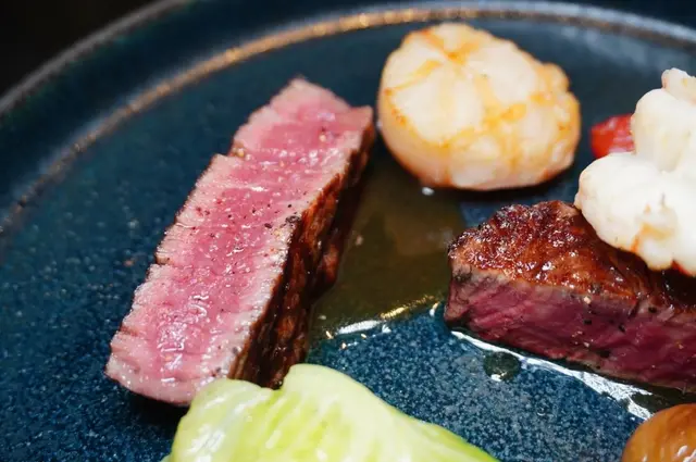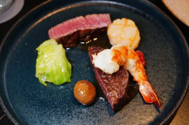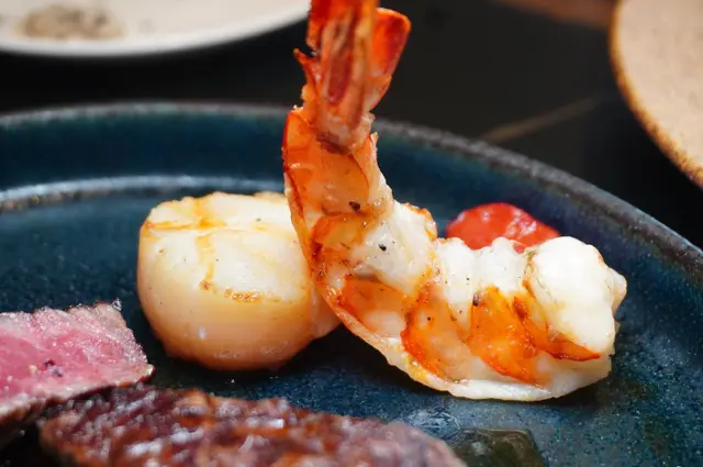 120天的穀飼澳洲菲力牛排搭虎蝦, 干貝