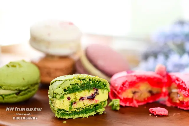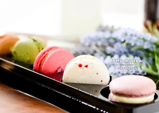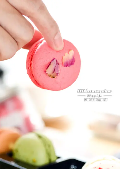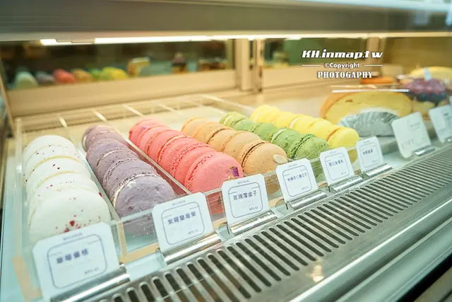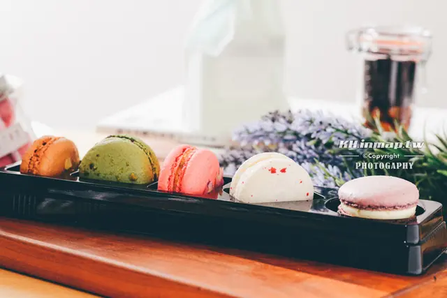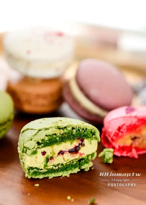 這天,正巧的是,師傅正在製作每個女人都會著迷的「少女般的酥胸-Macaron」,現出爐的各色Macaron擺放在櫃中,有代表戀愛色系的櫻花粉色「玫瑰覆盆子馬卡龍」、有金黃甜美的「檸檬蘋果馬卡龍」、也有雪白帶紅落葉的「草莓優格馬卡龍」,還有象徵著慾望的紫色「紫羅藍莓果馬卡龍」……..等等,一系列的手作Macaron,客單價落在55-65元之間,客人們總是可以任性地選購最對眼的顏色,去填補心中雀躍的小世界!