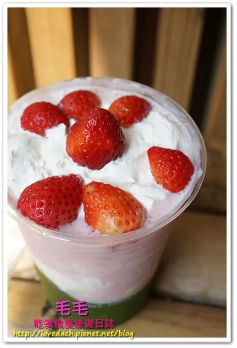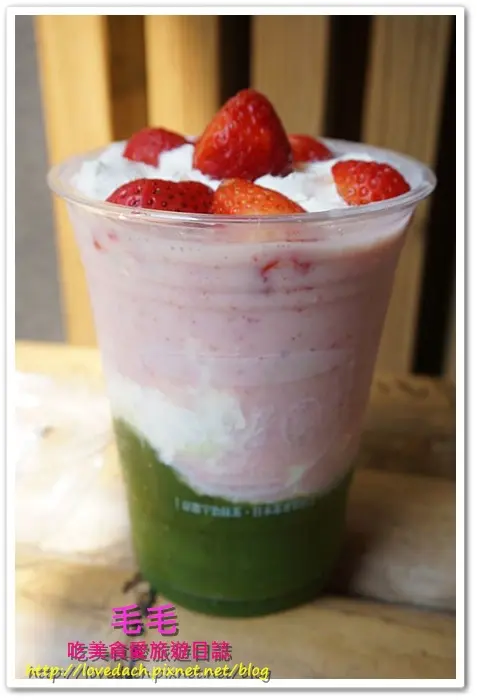 底下是濃濃的抹茶冰沙,上面則是草莓奶昔