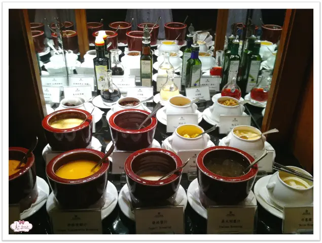 附餐有:湯,沙拉吧,主菜,甜點吧,飲品。