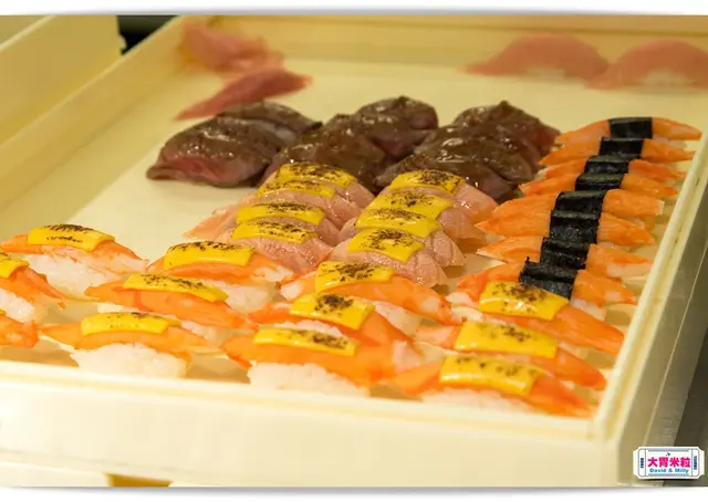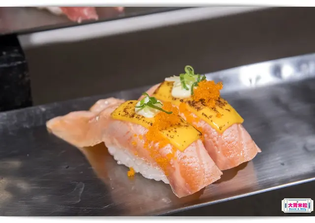 我最愛的「炙燒鮭魚握壽司」上頭特地放上起司片和魚子醬,吃起來濃郁鹹香,非常夠味