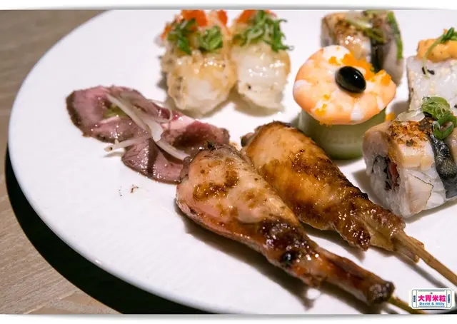 還有「鮭魚親子圓壽司」使用肥嫩鮭魚片配上鮭魚卵,上頭還有黑橄欖與紫洋蔥點綴,