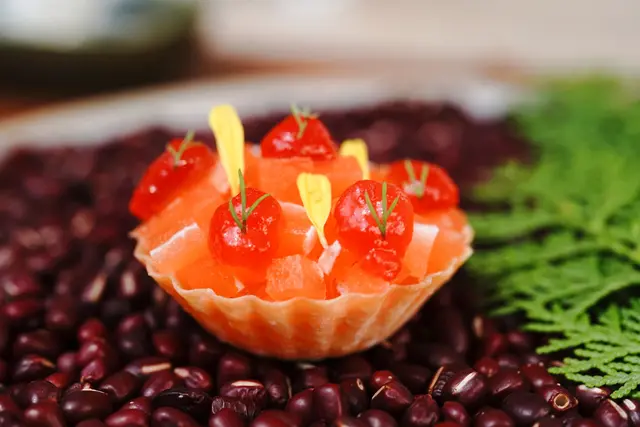 ▼發想自傳統煙燻鮭魚搭配酸豆做法,用餛飩皮做的小塔,煙燻過的蒟蒻就像鮭魚小丁,搭配酸屬性的發酵牛蒡與洛神花凝膠,吃起來酸味富含層次,清新爽口。