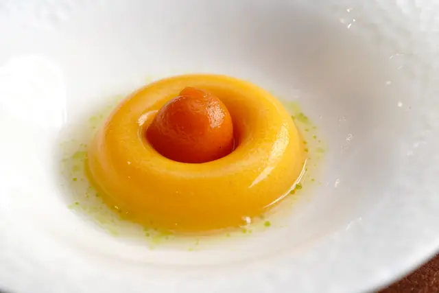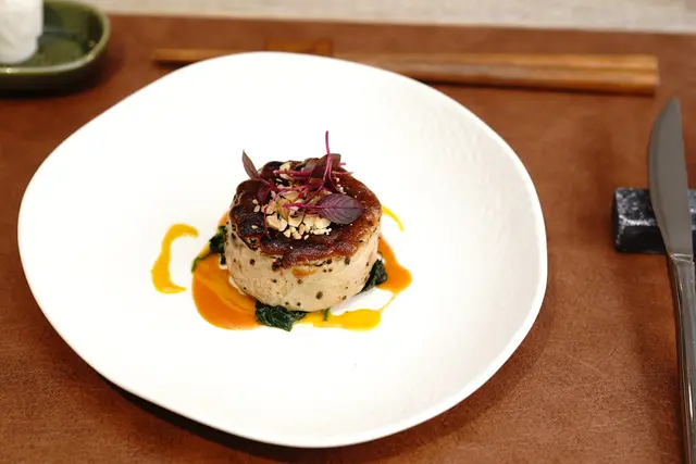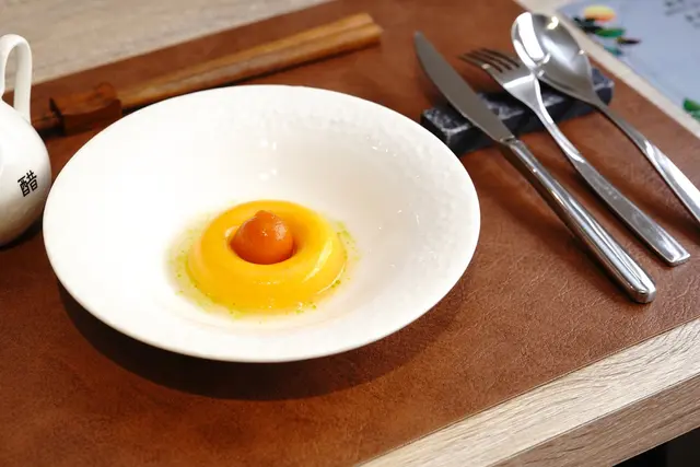 ▼底部是日式高湯,以南瓜+昆布熬煮,再加入羅勒油,中間則是來自宜蘭的蜜漬金棗,整體味道清爽甘甜。