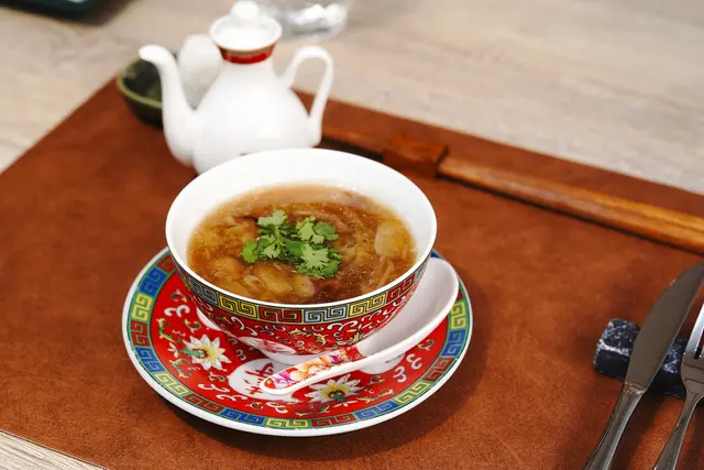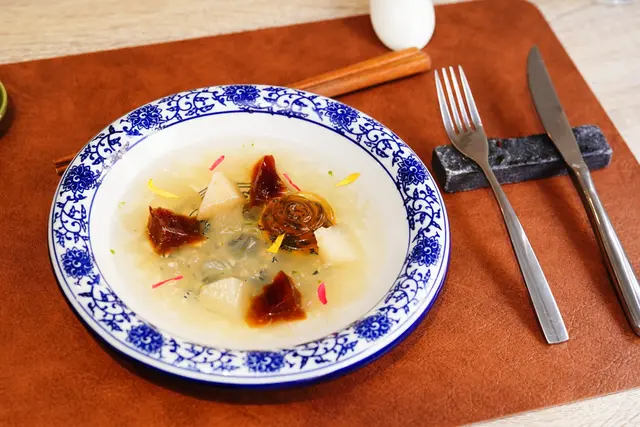 以純蔬食呈現傳統魚翅羹的風味,使用大量高纖蔬菜熬煮的高湯,羹湯喝起來鮮美迷人。
