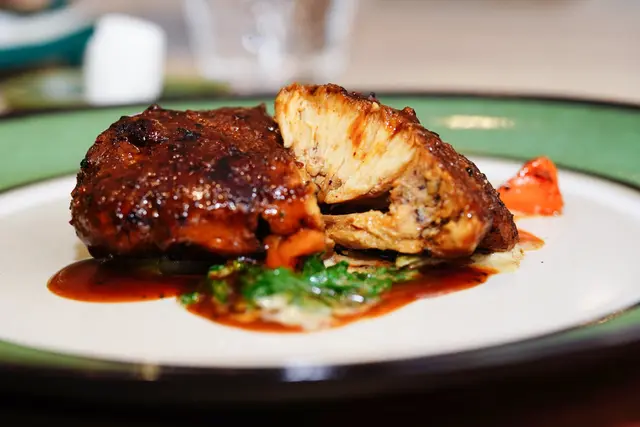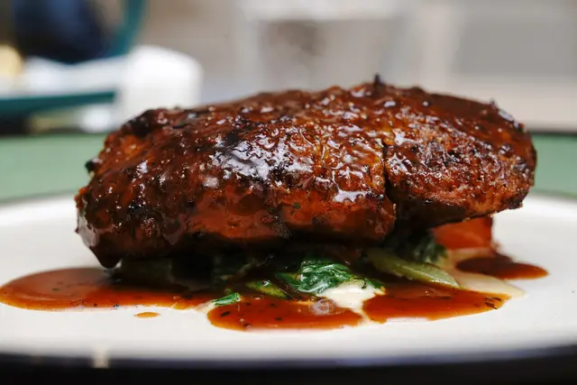 猴頭菇排刷全素照燒醬炭烤,風味濃郁、口感扎實多汁,搭配以黑胡椒和大量蔬菜熬煮的黑胡椒醬汁;底部是奶油燴時蔬以及芥菜。整體吃起來鮮美又不失強烈風味~