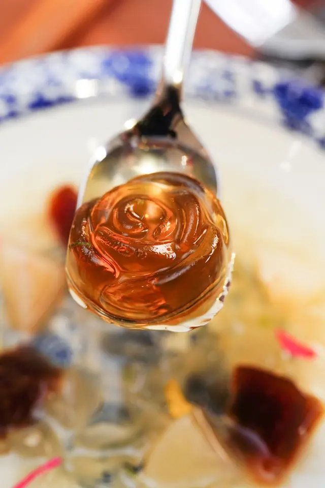 自然清香的甜湯,以冰糖、銀耳燉煮,中間是玫瑰形狀的桂花茶凍、搭配水梨、粉粿增加不同的口感,微甜滋味作為收尾剛剛好!