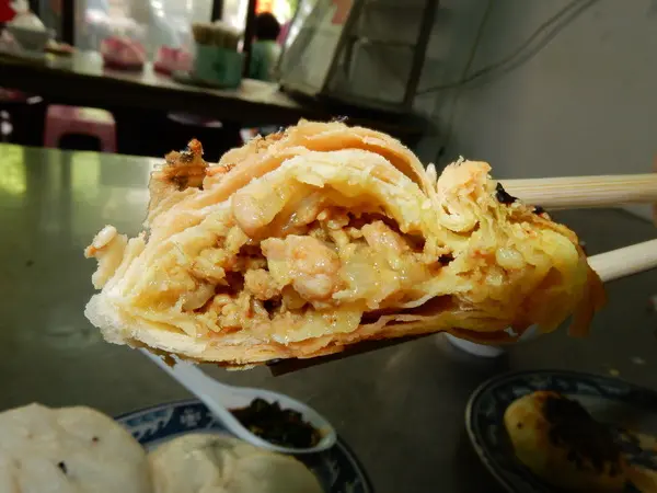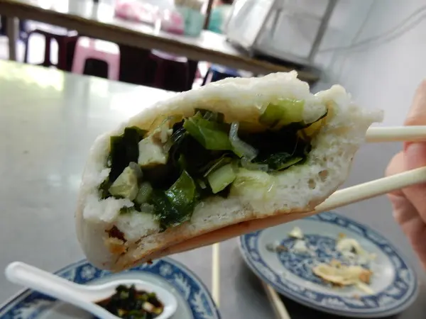 韭菜煎包相對遜色。內餡類似韭菜盒的韭菜、冬粉等組成,飽滿