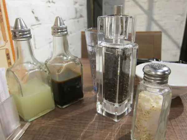 桌上的佐料分別是:檸檬汁-沾著肉吃較為清爽;醬油之類的;胡椒鹽;研鹽