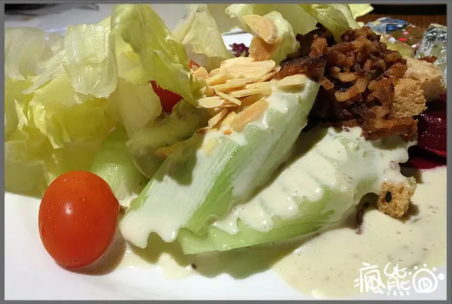 既然胃口開了那就從生菜沙拉再出發吧,嗯...灑上有點偏鹹可香氣十足的乾培根,讓這盤的風味更加深了許多呢。