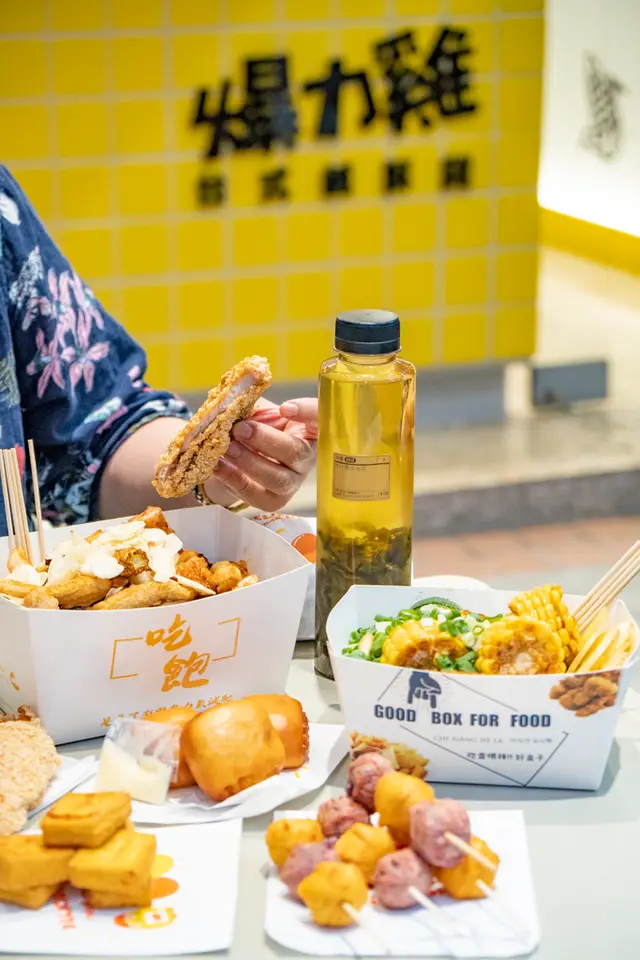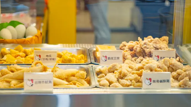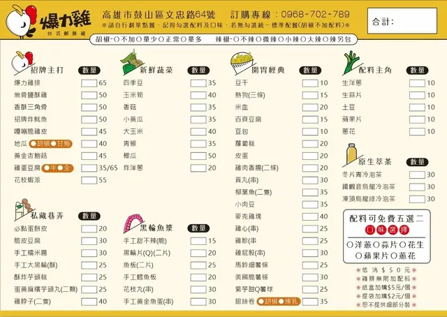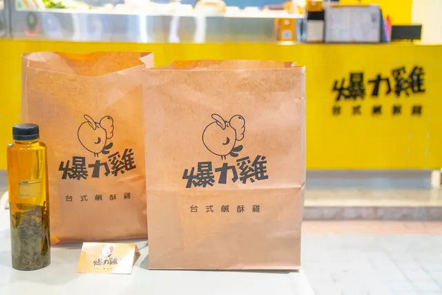 高雄爆力雞台式鹽酥雞,招牌是輕快明亮的黃色,相較於傳統鹽酥雞店,每日新鮮炸物也都至於冷藏櫃裡,