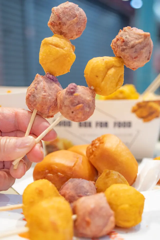 一顆紫心地瓜、一顆黃金薯球,帶有Q彈的咬感,內餡也有料!超級好吃!