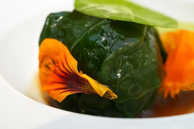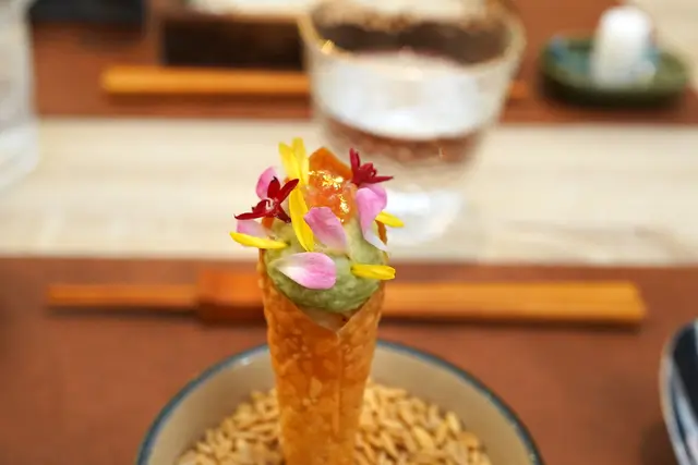 料理以冰淇淋小甜筒造型呈現,使用春捲皮自製,最下方是可可土壤,中間為新鮮小黃瓜、發酵黃甜菜,上方是帶些許酸口的毛豆泥,點綴拇指檸檬以及可食用鮮花瓣。