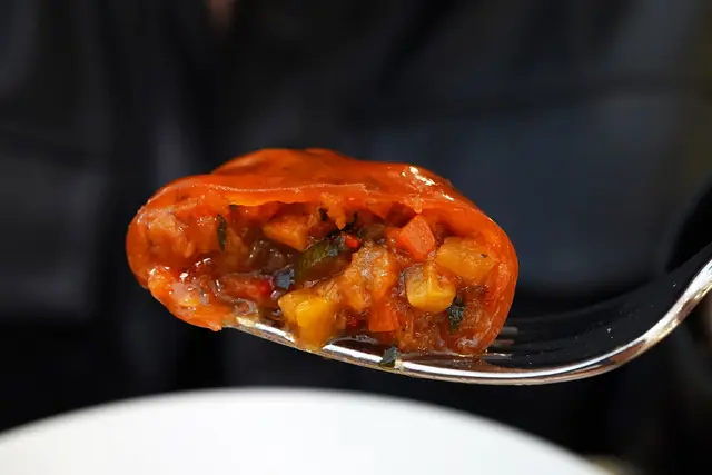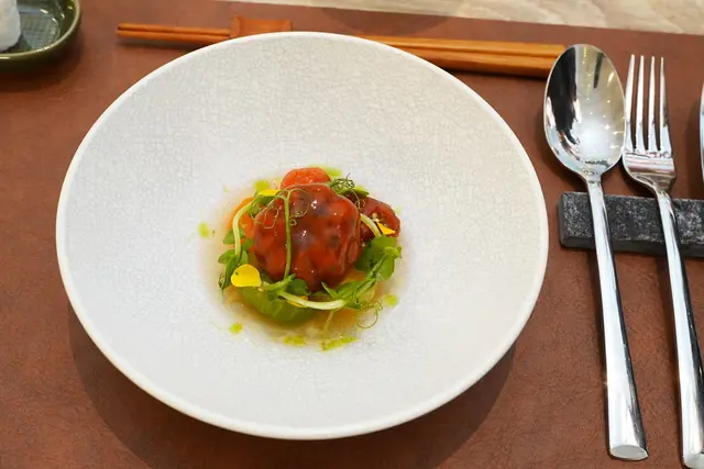 這一道是極致的番茄料理,可以品嚐到番茄的不同口味,去皮番茄吃起來口感清脆、燉菜丁吃起來軟嫩多汁、番茄外衣口感像果凍QQ略有彈性。