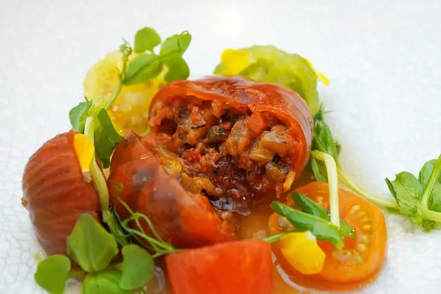 中間是電影《料理鼠王》很著名的料理——普羅旺斯燉菜Ratatouille,中心是綠櫛瓜、黃櫛瓜、圓茄、甜椒、新鮮蕃茄,外層是以蕃茄汁製作的外衣。