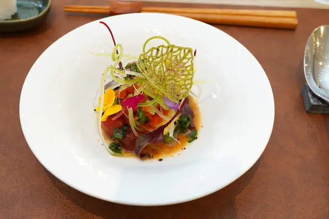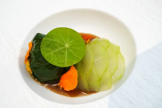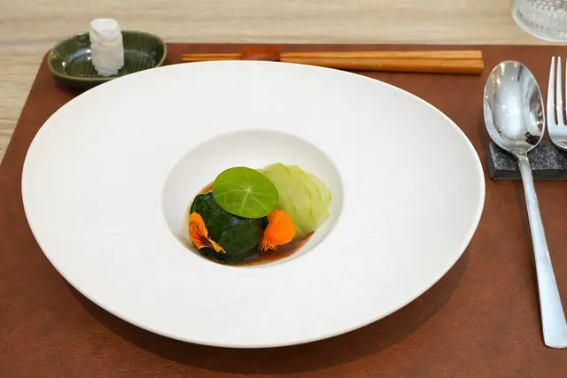 發酵油醋汁,基底為發酵牛蒡汁,搭配皎白筍、醋漬苦瓜、煙燻四季豆和甜豆、玉米筍、烏梅醃漬番茄,以及透明西芹絲、香椿風味餅乾。