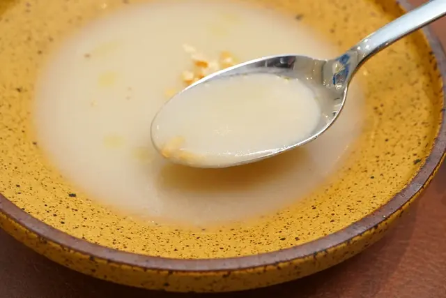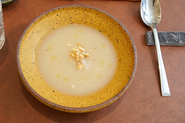 以豆薯和昆布高湯所熬製的濃湯,搭配燕麥、煙燻水蓮、掛霜腰果,淋上些許初榨橄欖油增添香氣。