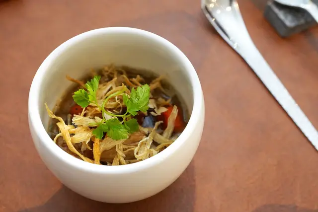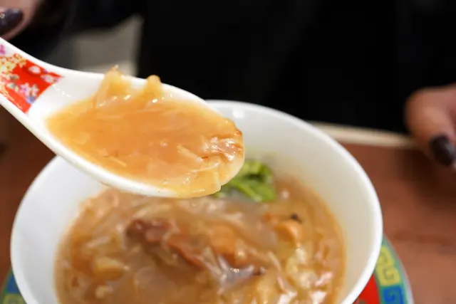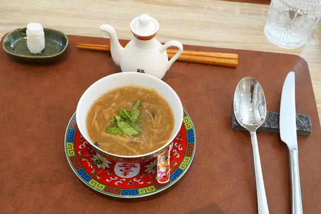 使用大量高纖蔬菜熬煮的高湯;搭配酥炸猴頭菇,一如傳統魚翅羹會有的排骨酥。