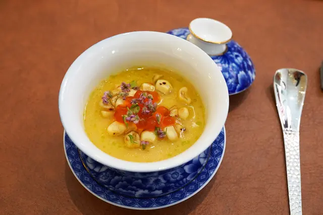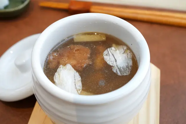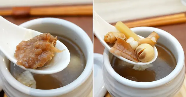 裡面加入帝王菇、蓮藕、蓮子、薏仁。上面漂浮的是野薑花,開蓋時能聞到淡淡花香,喝時也會飄散口鼻,湯的味道不會很濃郁,喝完很舒服的一道湯品。